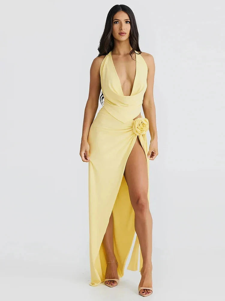 Command attention with the Annabelle High Slit Dress Set, a striking ensemble designed for unforgettable moments. Featuring a daring plunging neckline and an ultra-high side slit, this dress exudes confidence and elegance in equal measure. The flowing maxi-length silhouette drapes beautifully, while the included waist tie cinches the figure for a flattering finish. Available in timeless black, sultry red, soft yellow, and bold fuchsia, this set is perfect for gala nights, upscale events, or any occasion where making a statement is a must. Pair it with strappy heels and minimal jewelry for an effortlessly glamorous look.