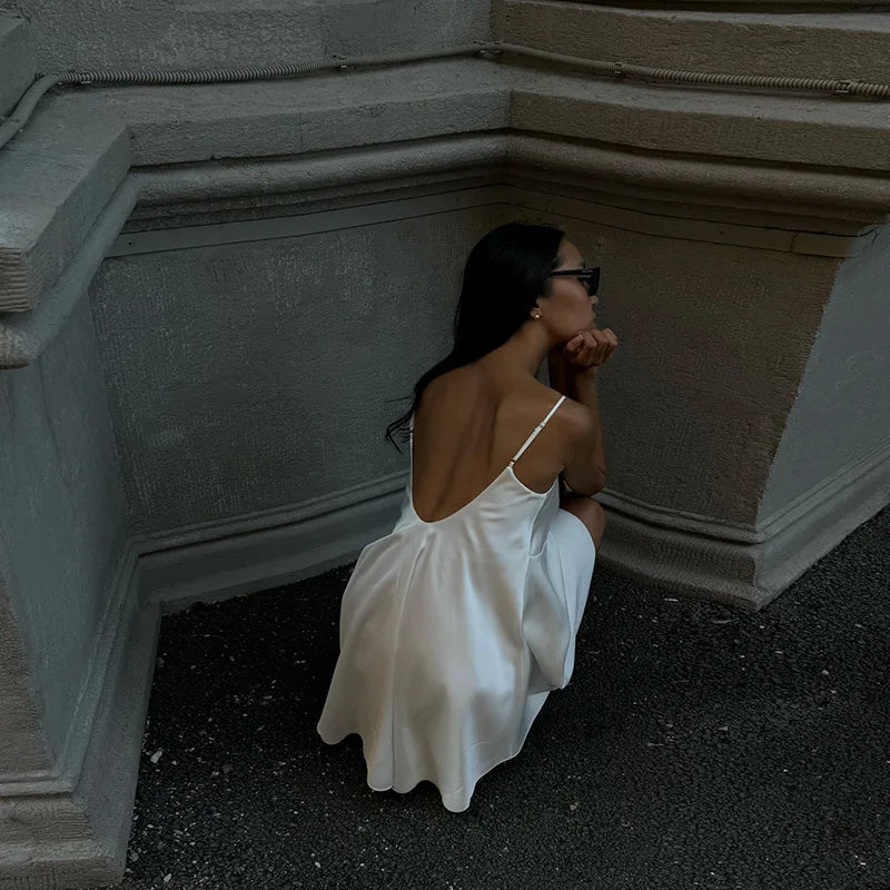 Ethereal and effortlessly elegant, the Angelica Spaghetti Strap Mini Dress is a must-have for refined minimalism. Crafted from a silky, lightweight fabric, this dress drapes beautifully over the body, creating a soft, flowing silhouette. The delicate spaghetti straps frame a flattering V-neckline, while the open back adds a hint of allure. The flirty mini length makes it perfect for summer soirées, romantic evenings, or a chic getaway look. Pair it with strappy heels and dainty jewelry for an effortlessly sophisticated ensemble.